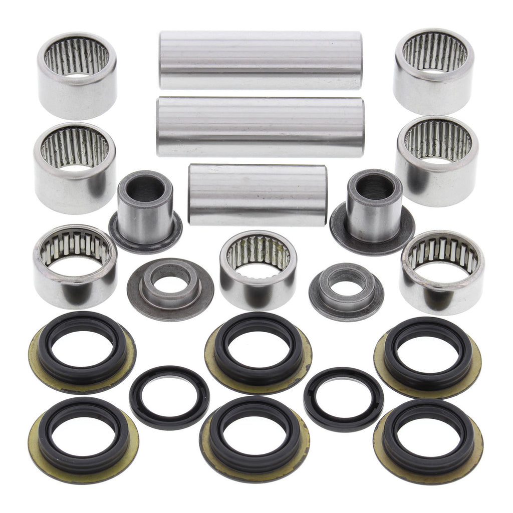 A Quality Suspension Linkage Kit from All Balls Racing. Kit includes lower shock bearing kit! Needle Bearings are made from 52100 bearing steel, ARC61-65 heat treated ST13 steel shell. Bushings are case hardened and plated to prevent wear and corrosion. Shafts are made from 52100 Bearing steel, through hardened and precision ground.
