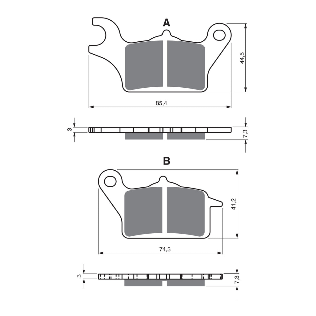 The S3 sintered compound is optimal in dry and wet conditions for road & off-road motorcycles. For the road application, S3 pads are suitable for both the front and rear brake while on off-road applications the S3 is only recommended for the front brake. The S3 series is designed for low abrasive interaction with the rotor and quieter braking due to the ceramic composite material. It has an HH friction rating and performs better at higher temperatures than the AD compound. Friction materials contain metal-ceramic with a bronze-graphite and non-metallic friction additives are spread evenly on the base fine bronze body to achieve optimal friction properties.