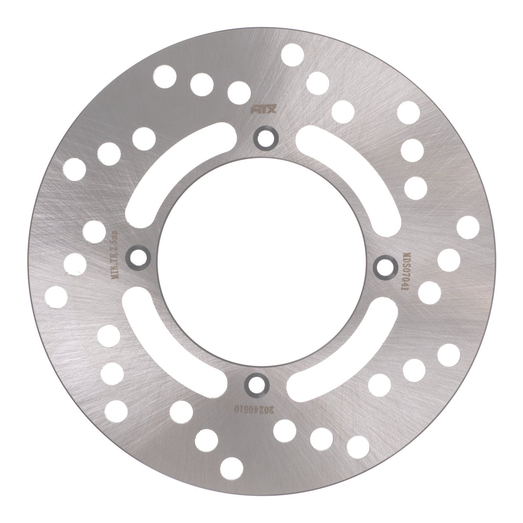 MTX solid discs are constructed using one complete segment of Japanese SUS 420 stainless steel, then heat-treated to HRC 36+-2. Lightening and drill hole patterns are as per OEM designs to improve braking performance and reduce the temperature of the disc.