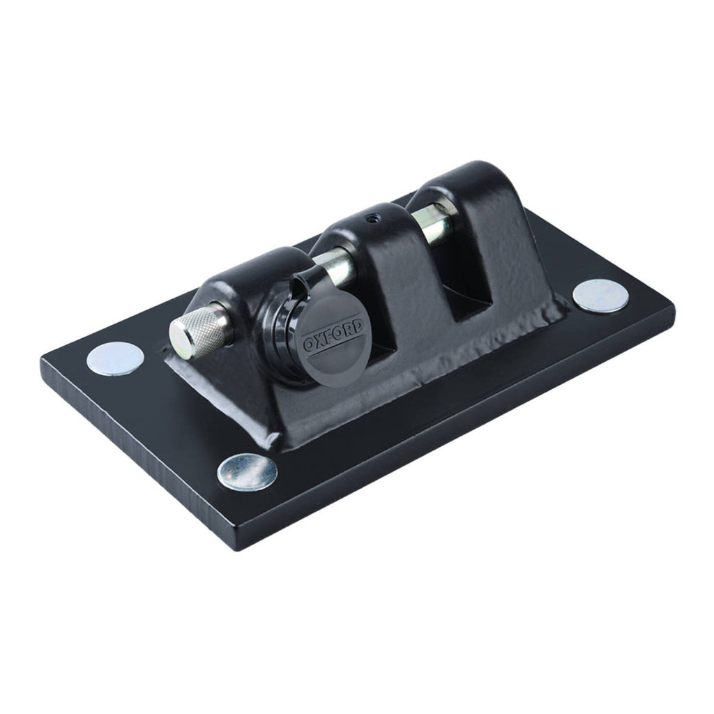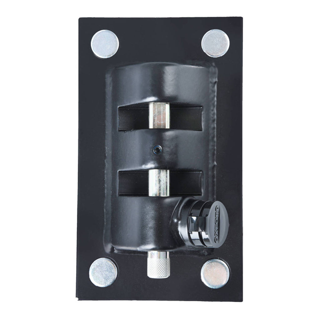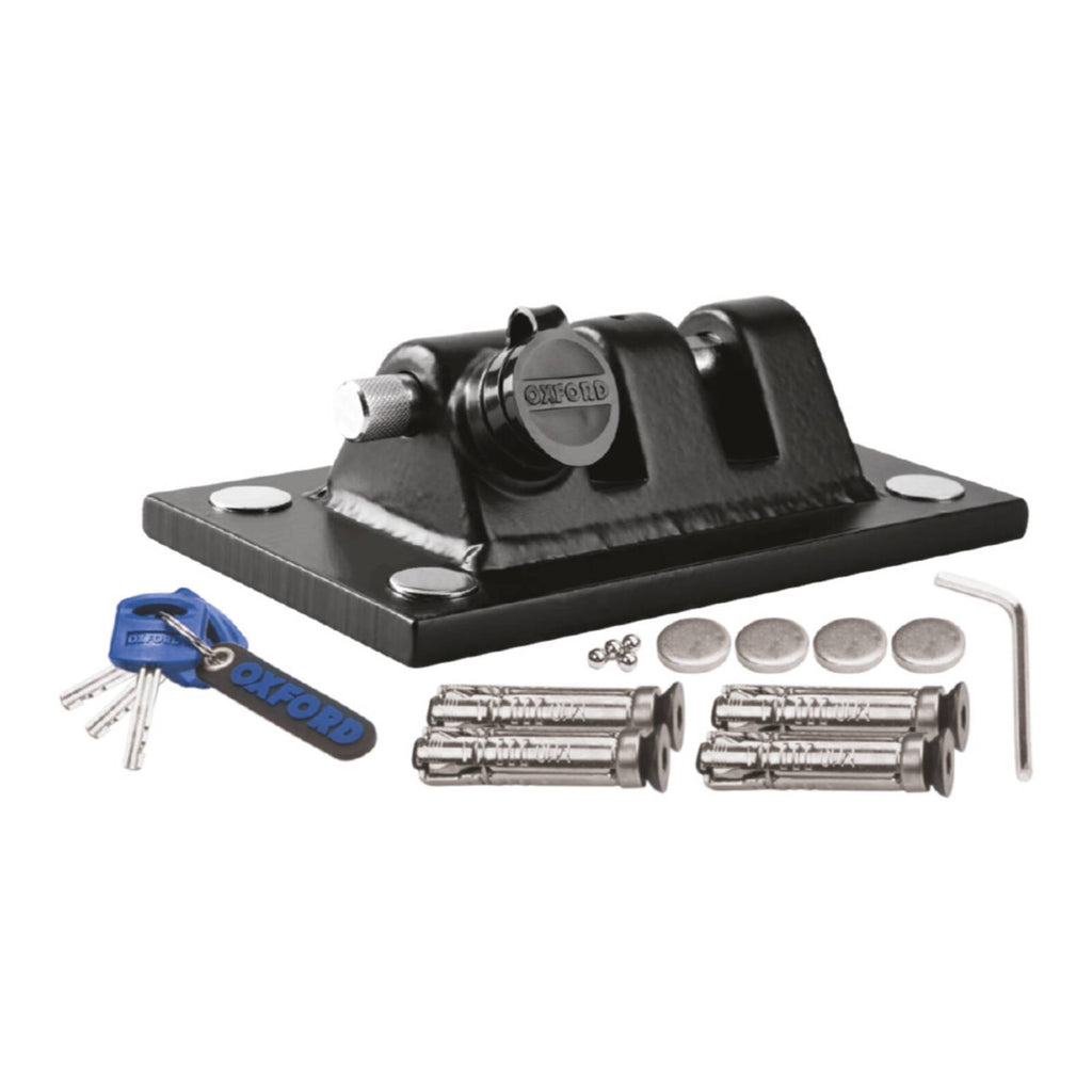 The Oxford Docking Station is the ultimate wall and ground anchor. It is made from forged hardened steel and incorporates its own in-built locking bar to retain a chain. To fit a chain for the first time, simply unlock, unscrew a small retaining screw, slide out the locking bar, fit the chain and close the locking and re-tighten the grub screw. Then, to use on a daily basis just unlock using the key and slide the bar out to release one chain end of the chain and secure it around your motorcycle and fit it back into the docking station and re-lock. Very convenient and very secure!