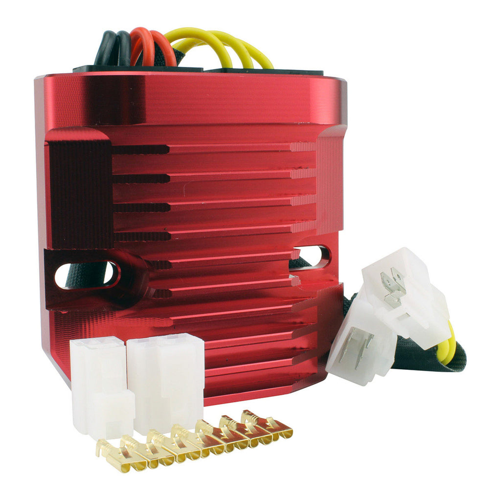Our new RMSTATOR machined aluminium Mosfet voltage regulator is a great upgrade for heat dissipation in any Powersports charging system. After 10 minutes of use, our billet aluminium heatsink runs cooler by 33% than standard cast regulator housings. Our new RMSTATOR red regulator, equipped with the renowned Mosfet regulation technology, is an added value to any three-phase permanent magnet charging system.